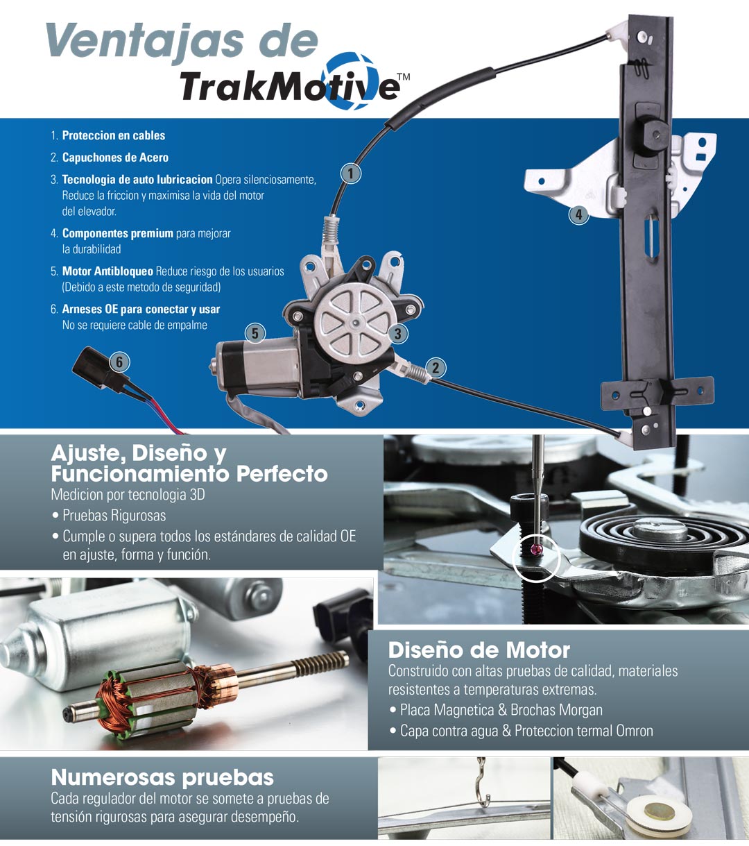 Los reguladores de ventanas de TrakMotive® utilizan un motor magnético de CC permanente especial para lograr que el mecanismo mueva el vidrio de la ventana hacia arriba y hacia abajo libremente. Los reguladores de ventanas utilizan un suministro de energía de 12 V (los vehículos diésel, de 24 V) y están controlados mediante un interruptor combinado. Nuestros reguladores de ventanas les proporcionan a los ocupantes conveniencia, comodidad y confiabilidad. Fabricamos los reguladores de ventanas con una función anti-pellizco para protegerlos a usted y a su familia.